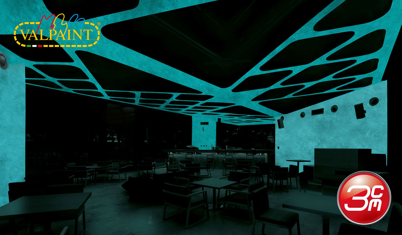Finitura puntinata all'acqua luminescente al buio e fluorescente alla luce di wood