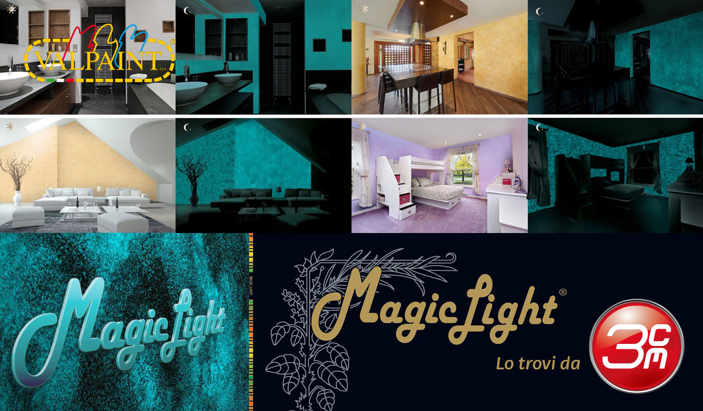 Pittura trasparente all'acqua per interno, che assorbe la luce naturale ed artificiale per poi restituirla al completo buio. MAGIC LIGHT, restituendo agli ambienti bui la luce incamerata, li rende sicuri e confortevoli anche in caso di black-out, trasformandosi dunque in fonte alternativa di luce, in situazioni di completa oscurità.